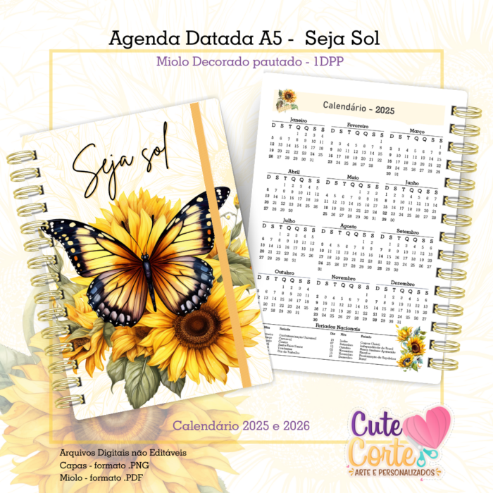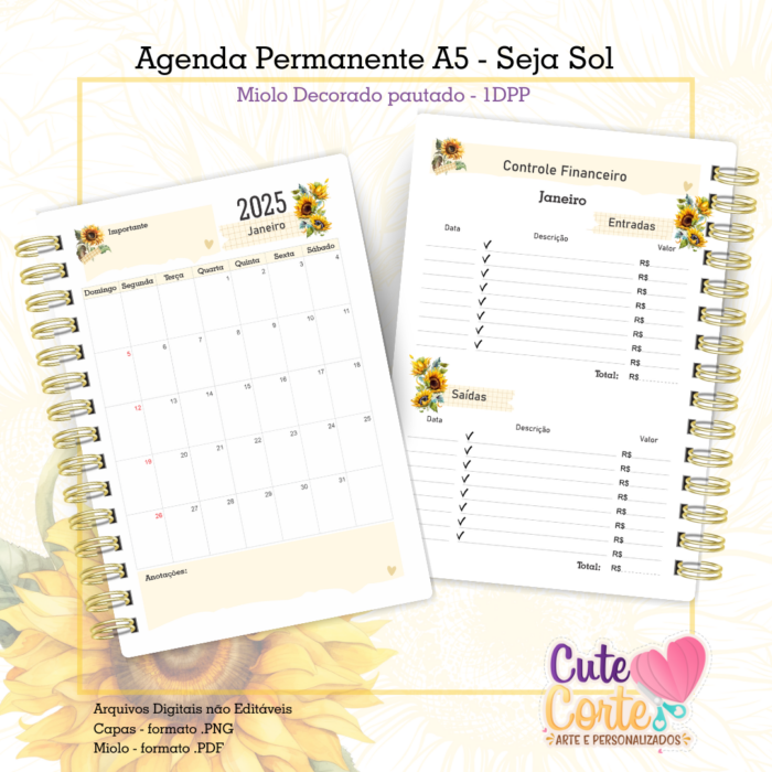 Miolo Agenda Composto por: Página Inicial, Informações Pessoais, Calendário 2025 e 2026, Metas 2025, Datas Importantes, Controle Financeiro Mensal, Página Principal;