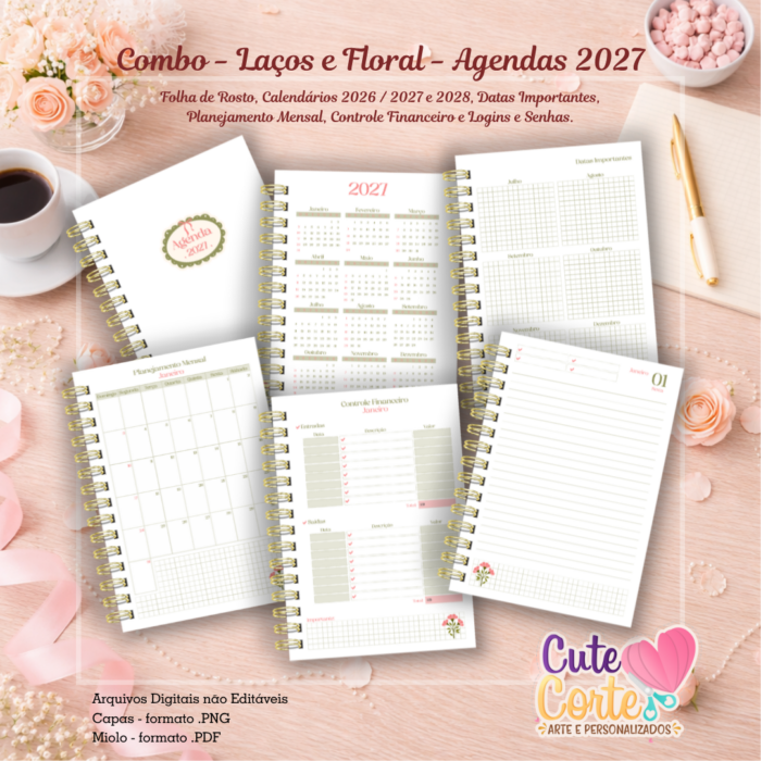 Composição: Dados Pessoais, Calendários 2026, 2027, 2028, Datas Importantess, Planejamento Mensal, Logins e Senhas e Controle Financeiro